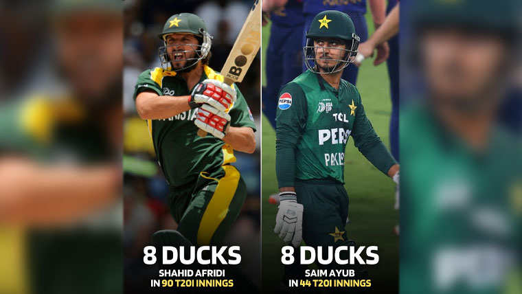 ٹی 20 انٹرنیشنل کیریئر میں صائم ایوب آٹھویں مرتبہ صفر پر آؤٹ ہوئے جو کہ شاہد آفریدی کے ریکارڈ کے برابر ہے، شاہد آفریدی نے 98 میچوں میں آٹھ بار بغیر کوئی رنز بنائے آؤٹ ہونے کا ریکارڈ بنایا تھا۔